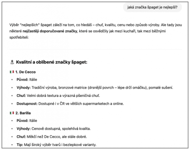Naší novou misí jako marketérů je tedy zaujmout AI agenty natolik, aby naši značku zahrnuly do své jednoduché vygenerované odpovědi. A pak už jen stačí, aby se uživatel zeptal na tu správnou otázku: